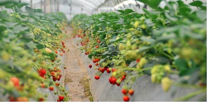 8月上中旬,采用遮光率为50%~60%的黑色遮阳网(寒冷纱)等对草莓苗遮光,遮阳网距地面1~1.5米,处理1个月左右,一旦花芽分化应立即撤去遮阳网;