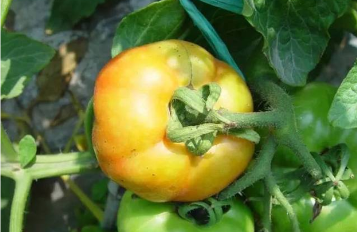 果实在转色过程中,会因为温度、光照、营养等因素的变化,影响到茄红素的积累,导致果实颜色异常。此类现象在高温和低温等温度异常的条件下,都容易出现。