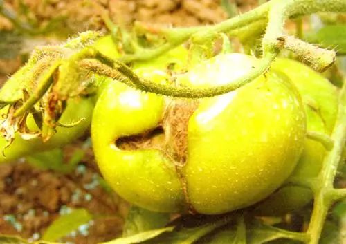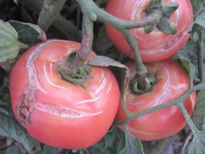 为达到保花保果的效果,番茄生产过程中过多使用2,4-D或防落素等植物生长调节剂,但是使用过程中药剂使用浓度过大、蘸花时间选取不当、温度不合适、重复蘸花等因素,均容易形成畸形果。