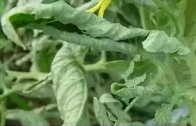 病毒病一般可通过蚜虫、粉虱等传播。当植株出现病毒病时,会由上而下出现全部或部分的叶片向上弯卷,同时出现叶片褪绿、变小、皱缩、丛生等现象,严重时只有叶脉而无叶肉,多表现在心叶及上部叶片上。